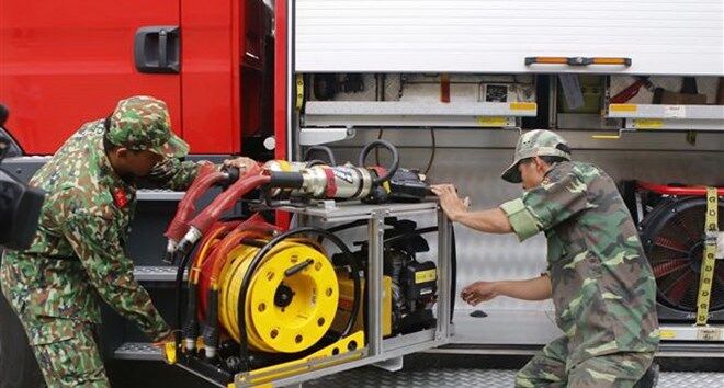 Các chiến sỹ kiểm tra trang thiết bị xe cứu nạn, cứu hộ