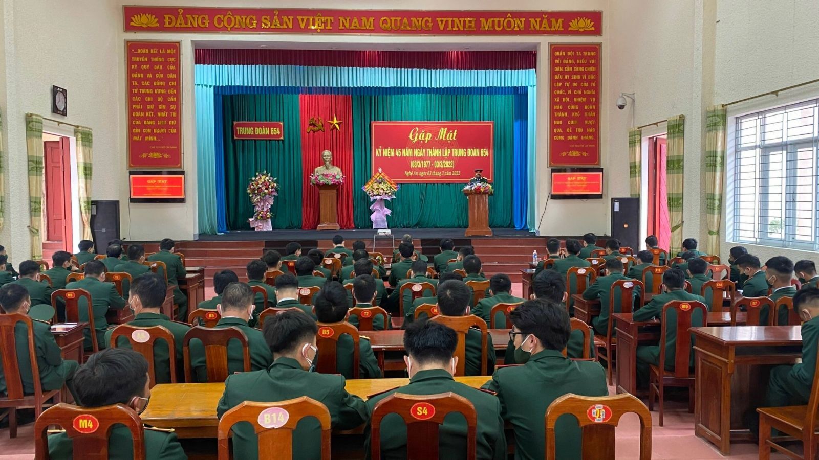 VNHN - Sáng ngày 03/3/2022, Trung đoàn 654 - Cục Hậu Cần Quân khu 4, tổ chức Gặp mặt Kỷ niệm 45 năm Ngày thành lập (03/3/1977 – 03/3/2022). Dự buổi gặp mặt có các đồng chí trong Thường vụ Đảng uỷ, Chỉ huy Trung đoàn và cán bộ, chiến sỹ các cơ quan, đơn vị. Vì điều kiện dịch Covid-19 đang diễn biến phức tạp nên đơn vị chỉ tổ chức nội bộ.