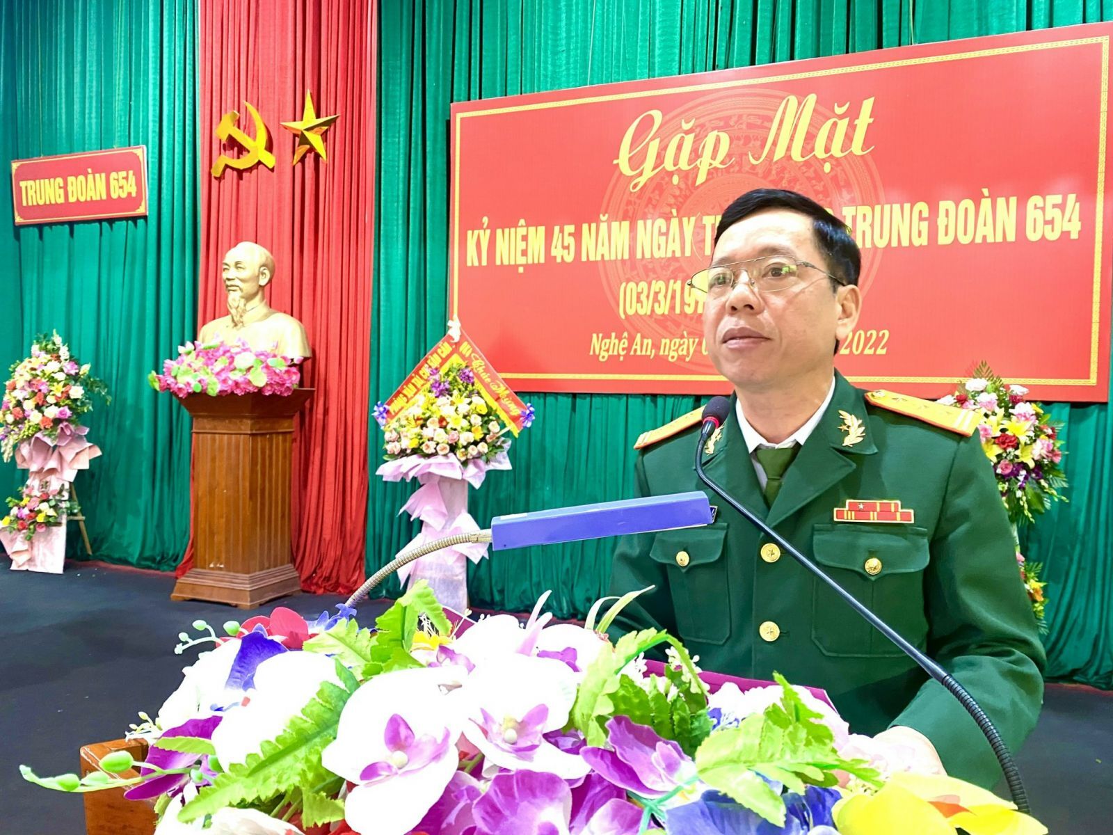 Tại đây, các thế hệ cán bộ, chiến sĩ Trung đoàn 654, đã cùng nhau ôn lại truyền thống 45 năm xây dựng, chiến đấu và trưởng thành. Theo đó, Trung đoàn 654, thuộc Cục Hậu cần là một đơn vị vận tải chiến lược của Quân khu 4. Lực lượng vận tải Quân khu 4, ra đời từ rất sớm ngay trong kháng chiến chống thực dân Pháp xâm lược; đã tham gia vận chuyển lương thực, thực phẩm phục vụ các chiến trường Bình Trị Thiên, Thượng Lào, Trung Lào, Hạ Lào và chiến dịch Điện Biên Phủ, góp phần vào thắng lợi chung của dân tộc. Bước sang cuộc kháng chiến chống Mỹ cứu nước, với một địa bàn chiến lược, Quân khu 4 vừa là tiền tuyến của miền Bắc Xã hội chủ nghĩa, vừa là hậu phương trực tiếp của miền Nam, do vậy yêu cầu vận tải chi viện con người, vũ khí, lương thực, thực phẩm cho các chiến trường ngày càng trở nên cấp thiết. Từ đây, tiểu đội, trung đội vận tải cơ giới, các Đại đội vận tải 32, 33, Tiểu đoàn vận tải 32, 34, 781 và các binh trạm của Quân khu, với nhiệm vụ vận tải chi viện cho các chiến trường góp phần cùng quân, dân cả nước hoàn thành sự nghiệp giải phóng dân tộc xây dựng và bảo vệ Tổ quốc Việt Nam xã hội chủ nghĩa. Sau ngày đất nước được thống nhất, trước yêu cầu nhiệm vụ mới đòi hỏi phải xây dựng đơn vị vận tải theo hướng chính quy, nâng cao năng lực vận tải đảm bảo một hướng chiến lược trên một địa bàn chiến dịch, sẵn sàng đối phó với mọi tình huống trong điều kiện cả nước vừa có Hòa Bình vừa có thể xảy ra chiến tranh. Ngày 03 tháng 3 năm 1977, Thượng tướng Hoàng Văn Thái - Thứ trưởng Bộ Quốc phòng ký quyết định số 39-QP thành lập Trung đoàn vận tải 654 trực thuộc Quân khu 4 trên cơ sở sát nhập Tiểu đoàn 32, Tiểu đoàn 34 và Binh trạm 1, với chức năng nhiệm vụ là lực lượng thường trực sẵn sàng chiến đấu trong đội hình cơ bản của Quân khu, là đơn vị vận tải chủ lực phục vụ sẵn sàng chiến đấu và xây dựng kinh tế trên các hướng, các chiến trường và trong mọi tình huống…