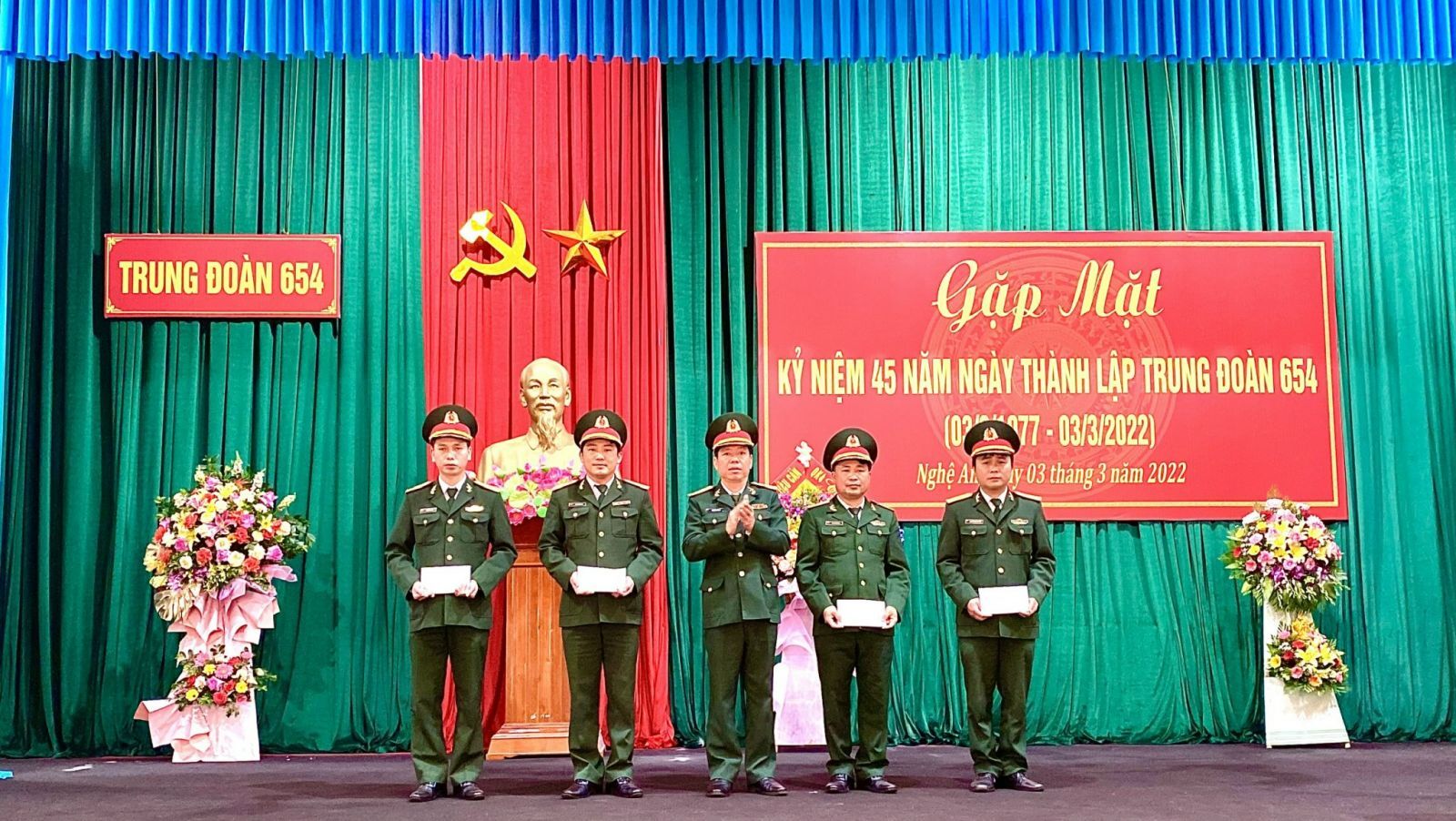 Thượng tá Nguyễn Đình Trường - Trung đoàn trưởng Trung đoàn 654 trao thưởng cho các tập thể, cá nhân có nhiều thành tích cao trong đợi thi đua cao điểm chào mừng ngày truyền thống đơn vị.