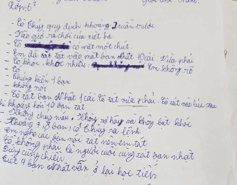 Báo cáo có đoạn: “Chiều 24/11/2018 nhà trường đã điều tra học sinh bằng phiếu điều tra. Kết quả phiếu lấy ý kiến từ 23 học sinh như sau: Sự việc xảy ra học sinh bị các bạn tát 231 cái tát là có thật nhưng trong đó có 13 em tát nhẹ, 8 em tát vừa, 2 em tát mạnh. Cô Thủy có chứng kiến 1 bạn tát sau đó mới rời khỏi lớp (11/23 em trả lời), 1 em trả lời chứng kiến 4 bạn tát, 1 em trả lời chứng kiến 3 bạn tát, 3 em không để ý).