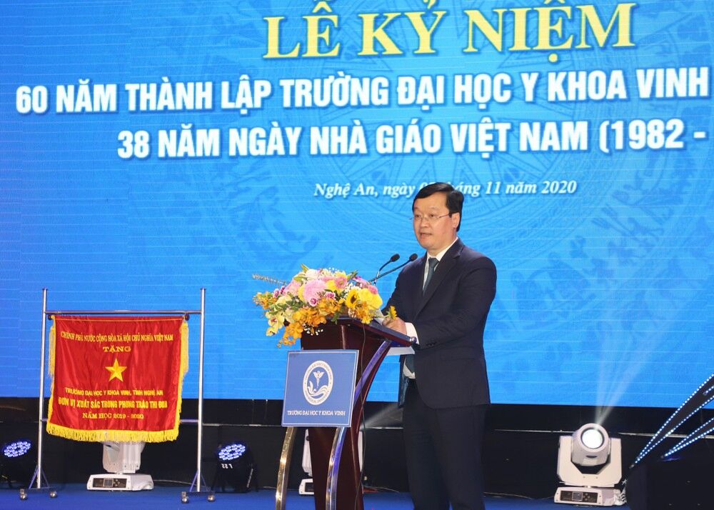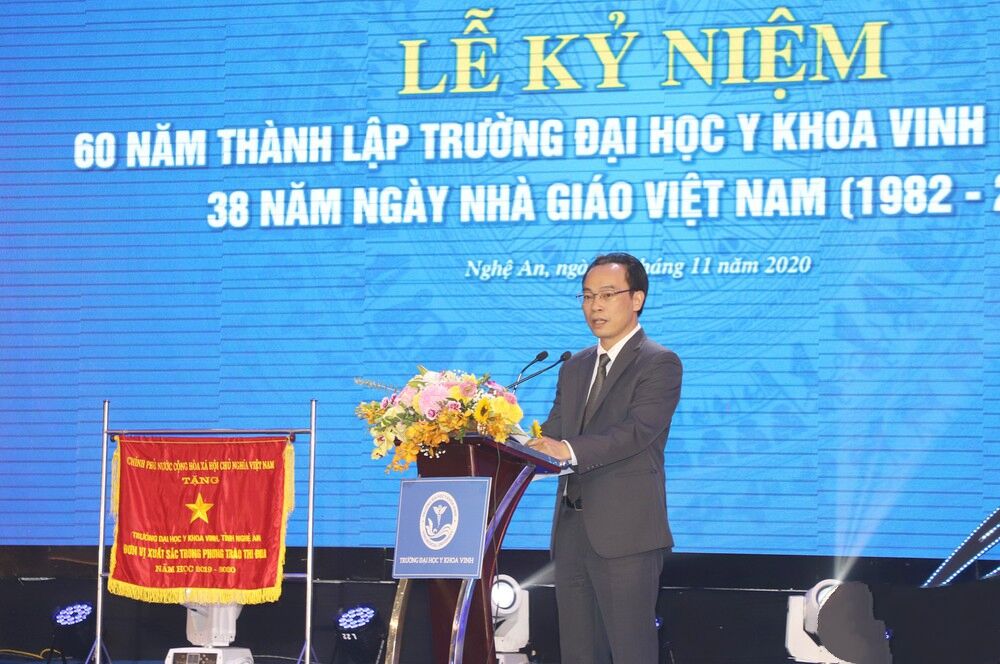 Nhân dịp này, thay mặt lãnh đạo tỉnh, Chủ tịch UBND tỉnh Nguyễn Đức Trung gửi lời tri ân và chúc mừng Ngày nhà giáo Việt Nam (20/11) đến toàn thể các thế hệ nhà giáo, cán bộ, viên chức đã và đang công tác trong ngành giáo dục lời chúc mừng tốt đẹp nhất, chúc tập thể lãnh đạo, cán bộ viên chức, giảng viên, người lao động của Trường Đại học Y khoa Vinh hoàn thành xuất sắc mọi nhiệm vụ được giao và tiếp tục có những đóng góp tích cực cho sự nghiệp giáo dục - y tế tỉnh nhà.
