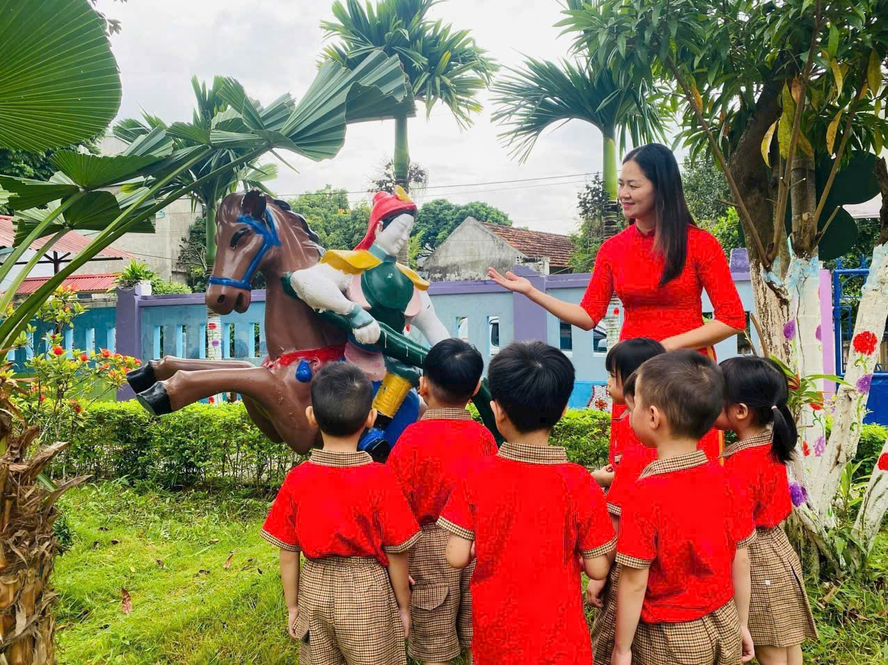 Các em được cô giáo hướng dẫn và tham quan khu vườn cổ tích