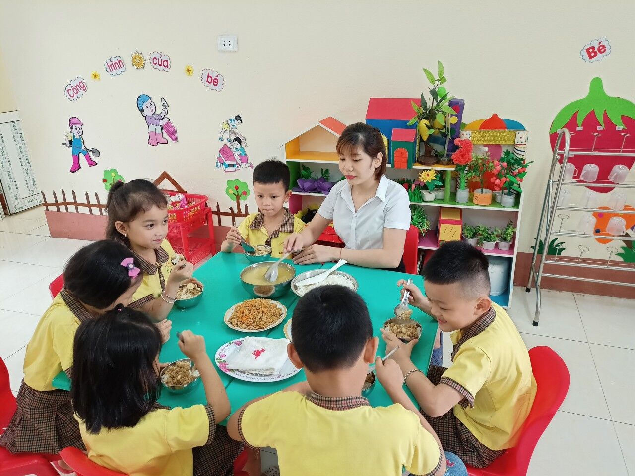 Chế độ ăn được đặc biệt quan tâm. Trường đã hợp đồng lương thực, thực phẩm sạch và tổ chức cho trẻ ăn một bữa chính và một bữa phụ, với mức ăn phù hợp với điều kiện của phụ huynh nhưng đảm bảo đủ chất dinh dưỡng, đảm bảo vệ sinh an toàn thực phẩm để trẻ có đủ sức khỏe để phát triển toàn diện. Đội ngũ cô nuôi có kiến thức về cách chế biến các mốn ăn hàng ngày cho trẻ, có sức khỏe tốt, không có bệnh truyền nhiễm, được khám sức khỏe định kỳ 2 lần trong năm, luôn có ý thức đảm bảo tốt vệ sinh môi trường, vệ sinh cá nhân và vệ sinh dụng cụ nuôi dưỡng, được tập huấn các lớp chuyên đề dinh dưỡng và vệ sinh an toàn thực phẩm.