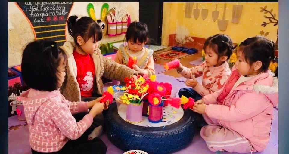 Cô và trò cùng nhau làm đồ chơi dựa trên nguyên liệu sẵn có của địa phương