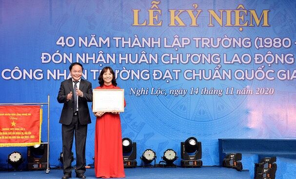 Đồng chí Thái Văn Thành – GS.TS.NGƯT, Tỉnh ủy viên, Giám đốc Sở GD&ĐT Nghệ An trao bằng khen của Bộ trưởng Bộ giáo dục và Đào tạo cho Nhà trường vì đã có thành tích xuất sắc trong phong trào thi đua “Đổi mới sáng tạo trong dạy và học”