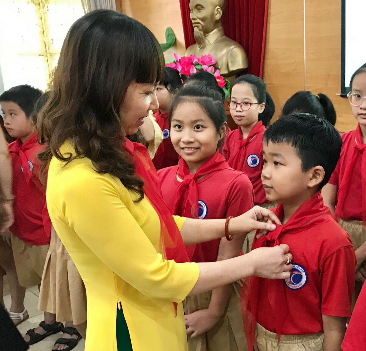 Nhà giáo Nguyễn Thúy Hiếu - Hiệu trưởng nhà trường luôn ân cần chăm sóc và kịp thời quan tâm, động viên học trò thân yêu để mỗi ngày đến trường là một ngày vui.