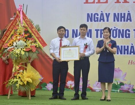 Đại diện lãnh đạo huyện Hoằng Hóa trao Bằng khen của Bộ Giáo dục và Đào tạo cho nhà trường