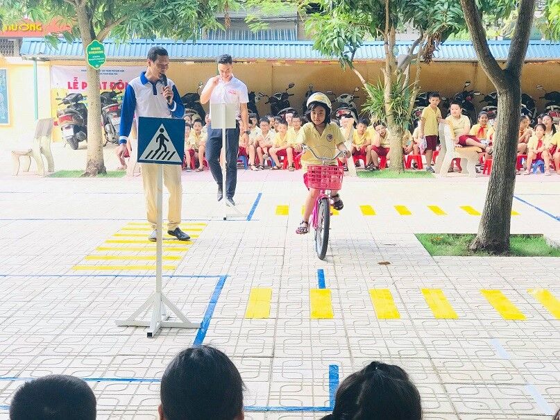 Giờ học thực hành đi xe đạp giúp các em học sinh nâng cao nhận thức chấp hành luật tham gia giao thông