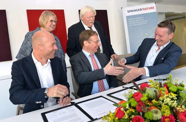 Lãnh đạo của Project Deal ký thỏa thuận với Springer Nature vào cuối tháng 8 vừa qua tại Berlin, Đức. Ảnh: Bettina Ausserhofer/Science magazine.