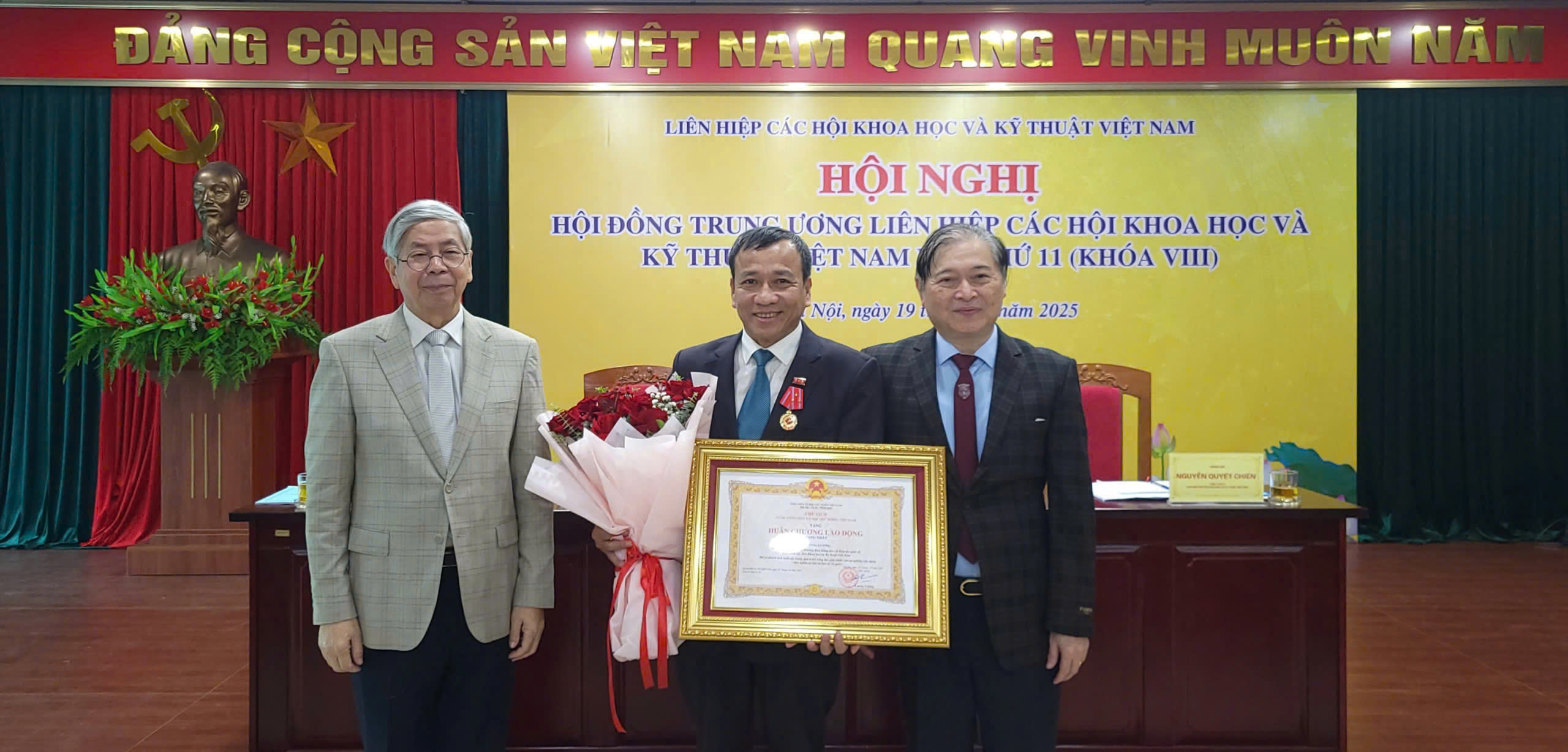GS. TSKH. Đặng Vũ Minh, Chủ tịch danh dự và TSKH. Phan Xuân Dũng, Chủ tịch LHHVN tặng hoa chúc mừng TS. Lê Công Lương đón nhận Huân chương Lao động hạng Nhất.