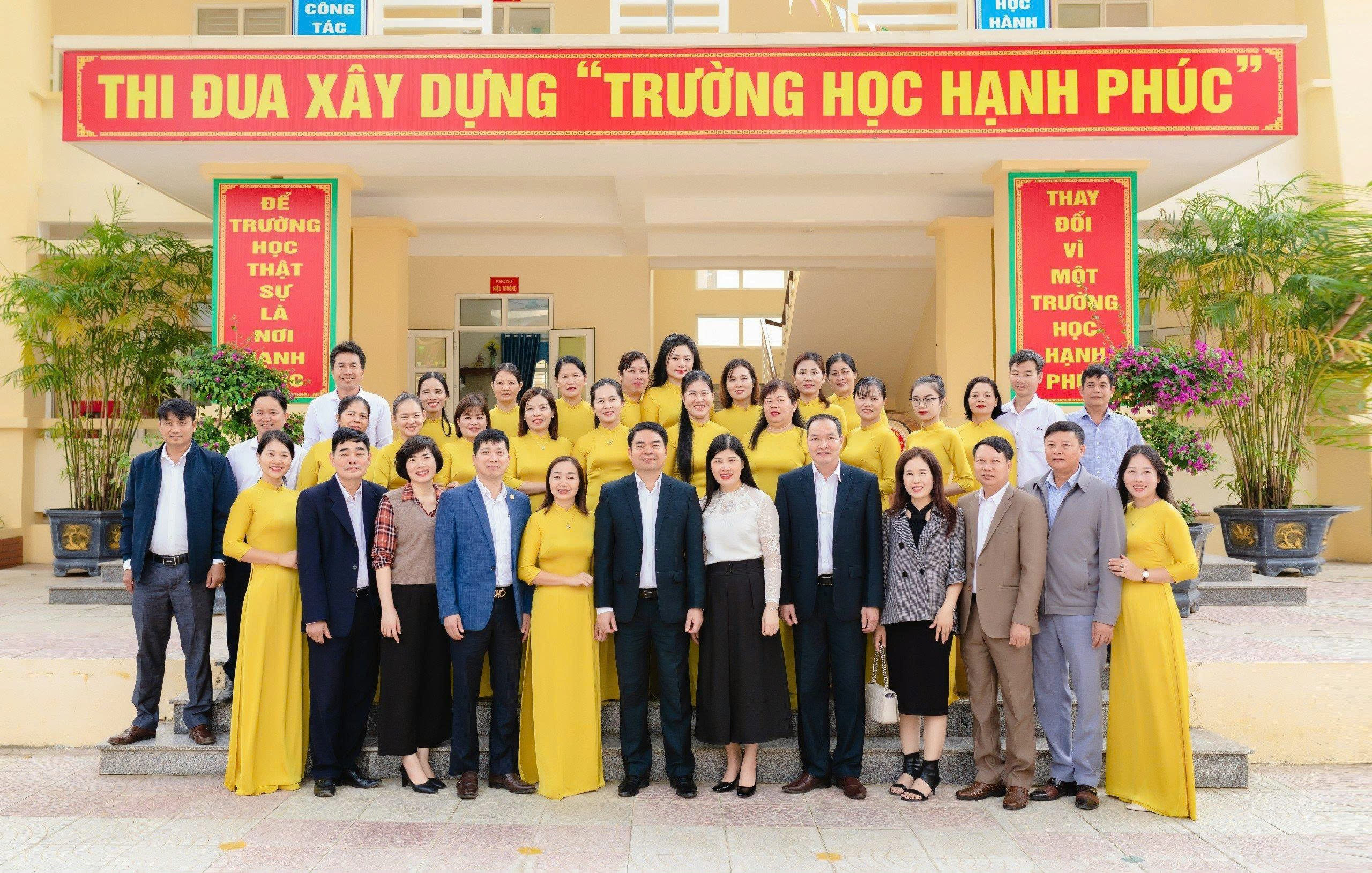 Ban giám hiệu cùng đội ngũ giáo viên nhà trường chụp ảnh lưu niệm cùng với các cấp