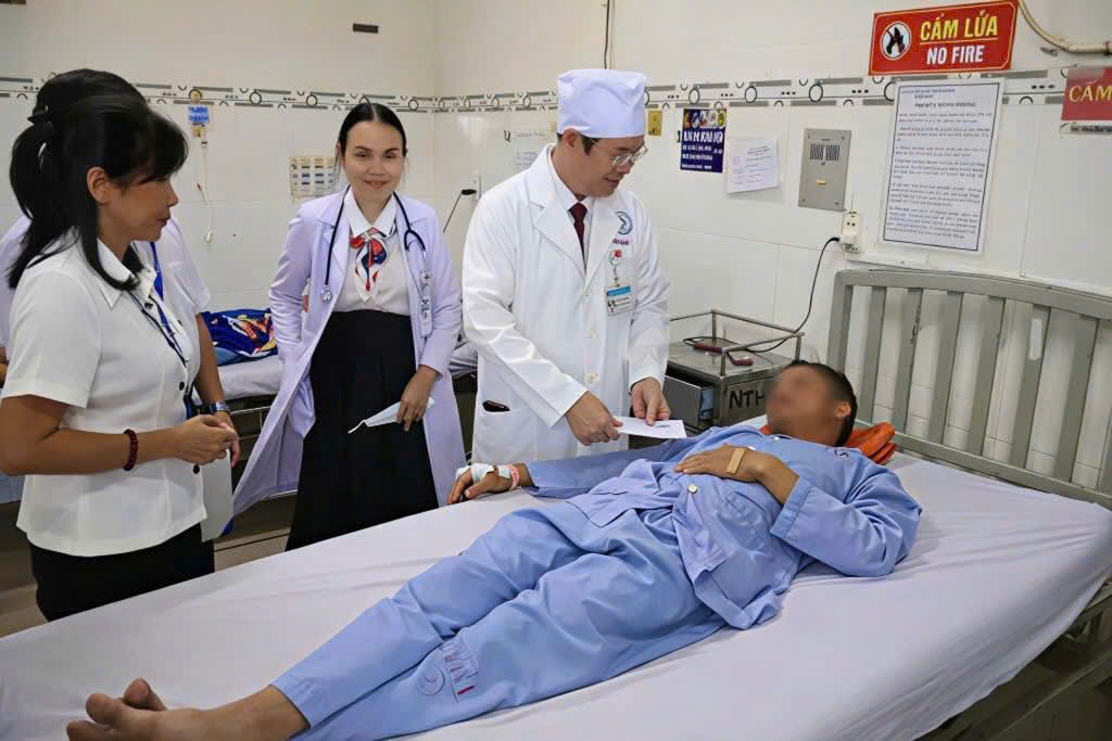 Thầy thuốc Ưu tú, ThS.BSCK II Lê Huy Thạch ân cần, tận tâm động viên thăm hỏi và tặng quà người bệnh điều trị tại Bệnh viện Đa khoa Ninh Thuận.