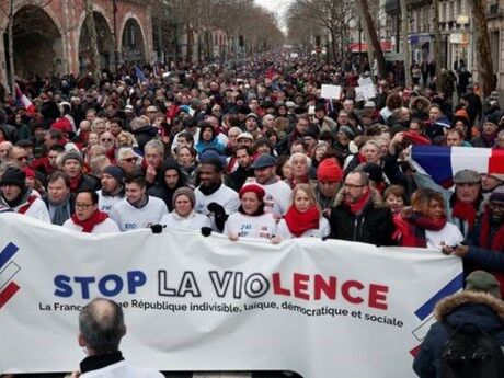 AFP đưa tin, hơn 10.000 người đeo khăn đỏ và giơ cao các khẩu hiệu chỉ trích làn sóng bạo lực trong các cuộc biểu tình của phe Áo vàng ngày 27/1 đã tuần hành trên đường phố thủ đô Paris, Pháp.