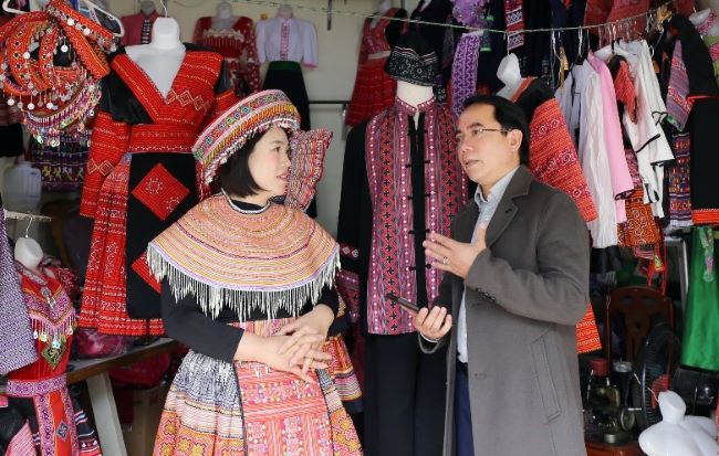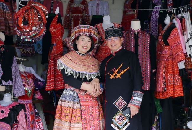 Kim Oanh giới thiệu thêm với tôi: Hai con cùng là cử nhân marketing Đại học Công nghiệp Hà Nội, sau khi học xong cũng bươn trải gần 10 năm trong Nam ngoài Bắc trước khi trở về tiếp nhận sứ mệnh phát triển nghề may thổ cẩm cùng mẹ. Đây chính là nơi mỗi một ma-nơ-canh được khoác lên những chiếc váy áo nam nữ dân tộc đạt tới độ thời trang và bắt mắt, nơi mỗi lượt du khách đi qua không thể không thắng phanh thật chậm để ngắm những chiếc váy áo trong khuôn kính rộng của gian trưng bày hàng mẫu. Không phải chỉ đẹp mà là rất đẹp. Tôi nhìn thấy mấy đôi bạn trẻ đang mê mải lựa chọn, mặc thử đồ và nghe “tư vấn” về các tư thế lát nữa sẽ độc diễn trên nền cỏ xanh, trong rừng mận trắng, trên thảm cúc vàng… từ cô bé Thạch Thảo. Cứ nhanh thoăn thoắt cho mỗi động tác vuốt ve vai áo, căn chỉnh mũ, tết nơ tóc, buộc cườm, khoác vòng… và ngoảnh lên vẫy chào tôi. Thạch Thảo nói rằng: Ngay ngoài cửa gian hàng trưng bày của nhà cháu, tối nào cũng một dãy các bà, các chị từ trong bản ra ngồi thêu tay, khách nước ngoài và nhiều người chen nhau vào xem, đông vui lắm, bác ạ…, cứ phải tới khuya mới tan…