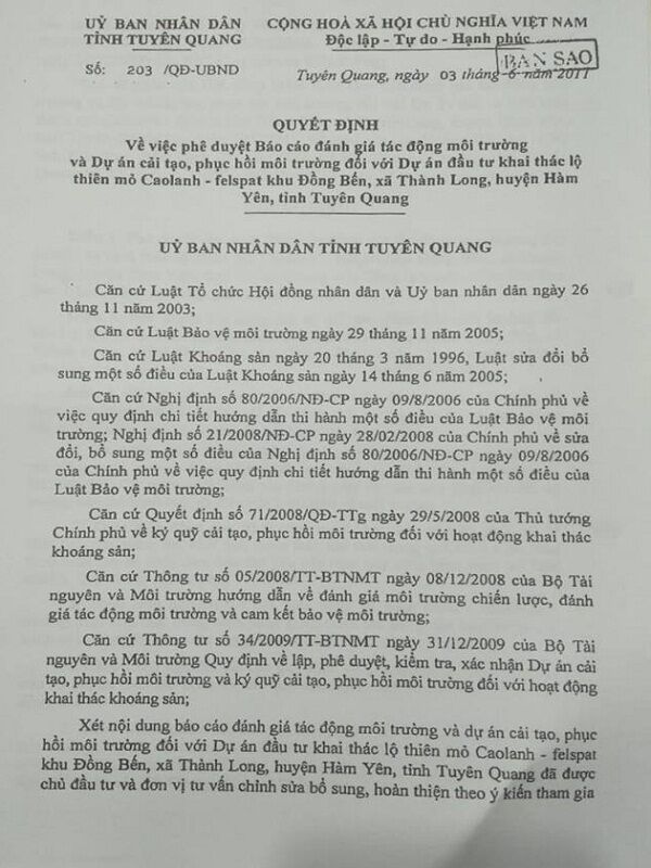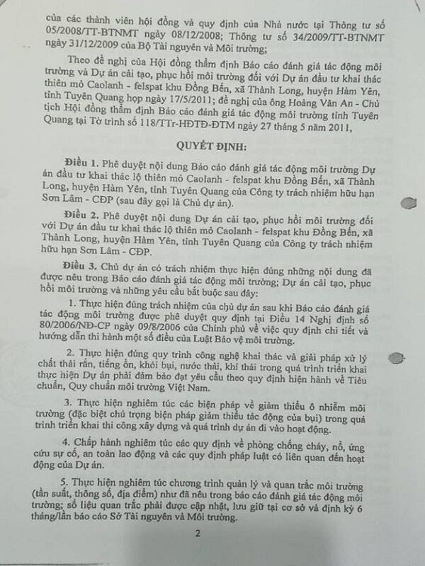 Quyết định về việc phê duyệt Báo cáo đánh giá tác động môi trường đối với Dự án đầu tư khai thác lộ thiên mỏ Cao lanh - Felspat của UBND tỉnh Tuyên Quang cấp cho Công ty Trách nhiệm hữu hạn Sơn Lâm - CĐP.