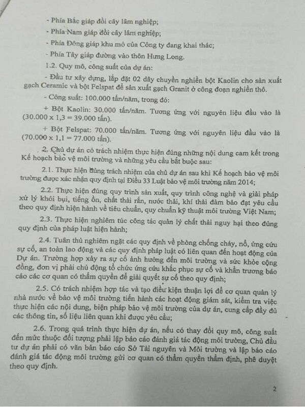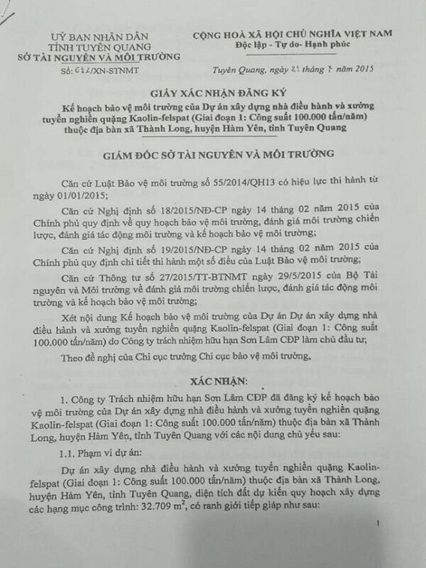 Cùng với đó, trong văn bản số 682/XN - STNMT ngày 21/7/2018 Giấy xác nhận đăng ký Kế hoạch bảo vệ môi trường của Dự án xây dựng nhà điều hành và xưởng tuyển nghiền quặng Kaolin - Felspat (Giai đoạn 1: Công suất 100.000 tấn/năm thuộc địa bàn xã Thành Long huyện Hàm Yên, tỉnh Tuyên Quang) của Sở Tài nguyên và Môi trường tỉnh Tuyên Quang cấp cho Công ty TNHH Sơn Lâm CĐP là chủ đầu tư dự án cũng yêu cầu thực hiện đúng những nội dung cam kết trong kế hoạch bảo vệ môi trường và những yêu cầu bắt buộc kèm theo.