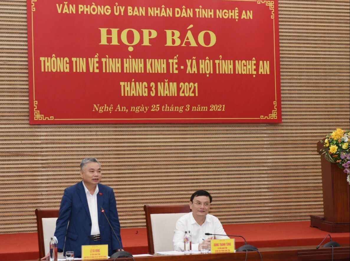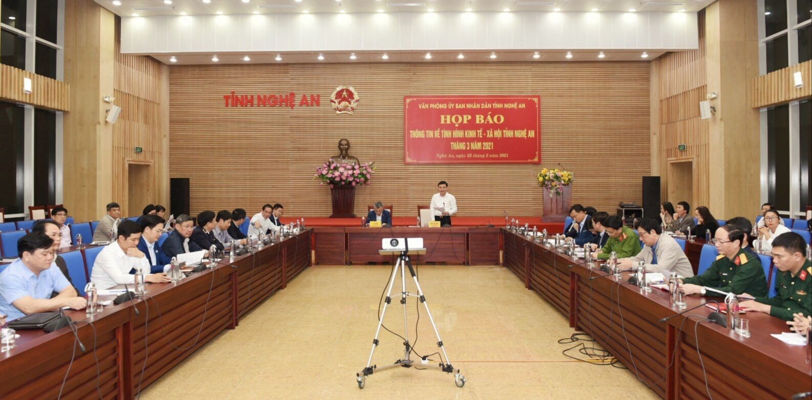 Báo cáo của Văn phòng UBND tỉnh tại buổi Họp báo cho biết: Kinh tế của tỉnh trong quý I/2021 đã đạt mức tăng trưởng khá (ước đạt 6,73%). Trong đó, nông, lâm, ngư nghiệp ước tăng 4,71%; công nghiệp - xây dựng tăng 11,7%; dịch vụ ước tăng 4,92%; thuế sản phẩm trừ trợ cấp sản phẩm ước tăng 4,25% so với cùng kỳ năm 2020. Công tác thu hút đầu tư và phát triển doanh nghiệp được đẩy mạnh với nhiều kết quả tích cực. Tính đến trung tuần tháng 3/2021, tỉnh đã cấp mới 16 dự án và điều chỉnh 27 lượt dự án với tổng vốn đầu tư cấp mới và tăng thêm hơn 7.000 tỷ đồng. Đặc biệt, trong quý 1, có 2 tuyến giao thông quan trọng là cầu Cửa Hội đã chính thức thông xe và đường giao thông nối Vinh - Cửa Lò đã cơ bản thông tuyến, tạo thuận lợi cho phát triển kinh tế - xã hội trên địa bàn.