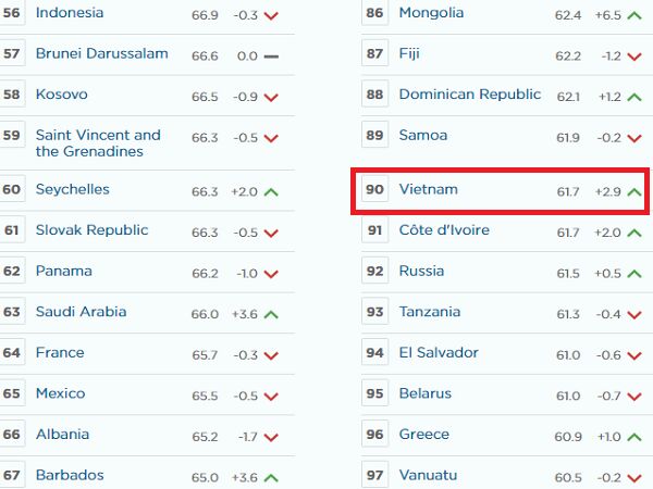 Việt Nam đã tăng 15 bậc để trở thành nền kinh tế tự do thứ 90/178 trên thế giới trong bảng xếp hạng Chỉ số tự do kinh tế (Index of Economic Freedom) toàn cầu trong năm 2021. Theo bảng xếp hạng do Quỹ Di sản (Heritage Foundation) vừa công bố, năm nay là lần đầu tiên nền kinh tế Việt Nam bước vào nhóm các nền kinh tế có "tự do trung bình" (Moderately Free). Với 61,7 điểm, tăng 2,9 điểm và thăng 15 bậc so với năm ngoái (nhóm hầu như không tự do).