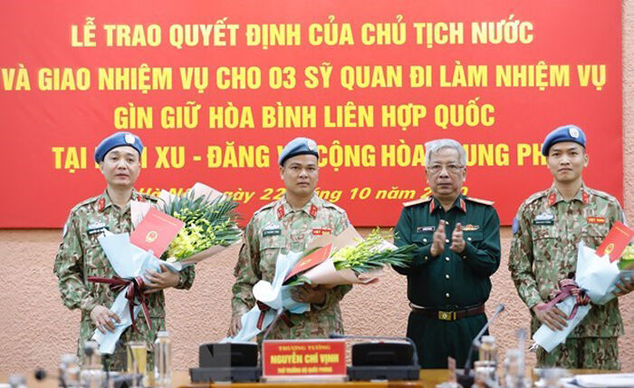 Thượng tướng Nguyễn Chí Vịnh, Thứ trưởng Bộ Quốc phòng trao Quyết định của Chủ tịch nước cho 3 sỹ quan thực hiện nhiệm vụ Gìn giữ hòa bình Liên hợp quốc tại Phái bộ Nam Sudan và Cộng hòa Trung Phi. (Ảnh: TTXVN)