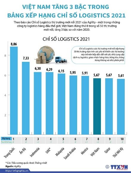Việt Nam đã tăng 3 bậc xếp hạng so với năm 2020, đứng ở vị trí thứ 8 trong top 10 quốc gia đứng đầu bảng Chỉ số Logistics thị trường mới nổi 2021.