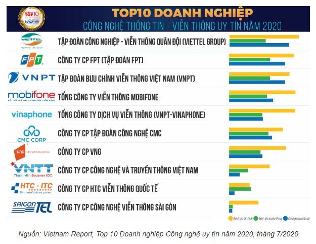 VNHN - Trong bảng xếp hạng Doanh nghiệp công nghệ uy tín năm 2020 theo công bố chính thức của Công ty cổ phần Báo cáo đánh giá Việt Nam (Vietnam Report), Tập đoàn Công nghiệp-Viễn thông Quân đội Viettel đứng ở vị trí số 1.