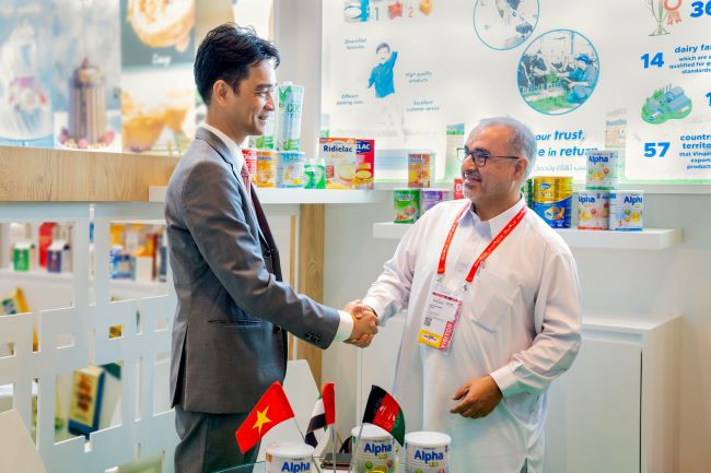Trong ngày khai mạc khu gian hàng nông sản Việt Nam tại Hội chợ, Ông Nguyễn Mạnh Tuấn - Đại sứ Việt Nam tại Tiểu Vương quốc Ả Rập (UAE) đã ghé thăm gian hàng của Vinamilk để trao đổi, động viên các doanh nghiệp tham gia sự kiện lần này.