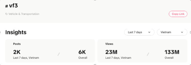 Dữ liệu từ TikTok cho thấy, từ khóa VF 3 đạt 2.000 bài đăng và 23 triệu lượt xem chỉ trong vòng 7 ngày.