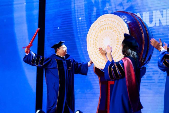 GS. Yap-Peng Tan đánh trống khai trường trong buổi Lễ khai giảng nhiệm kỳ đầu tiên của ông tại VinUni