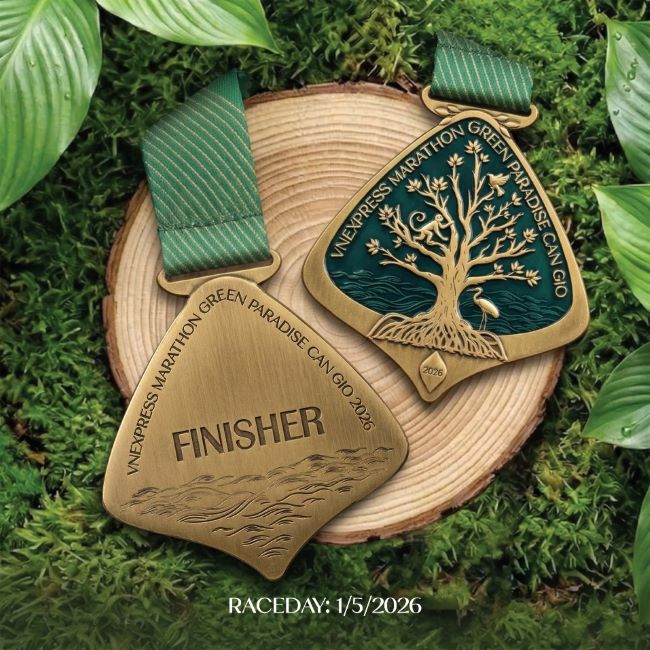 Lấy cảm hứng từ “viên ngọc xanh” Cần Giờ, chiếc huy chương được thiết kế như một lát cắt thiên nhiên – nơi hệ sinh thái rừng ngập mặn hiện lên sống động qua từng chi tiết.