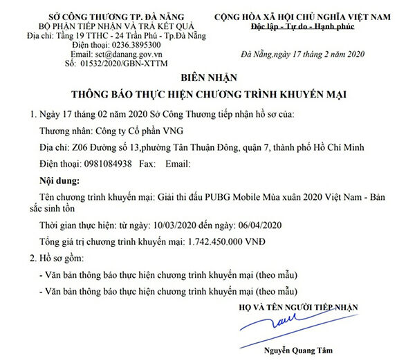 Giấy tiếp nhận hồ sơ khuyến mãi tổ chức giải đấu VNG của sở Công Thương.