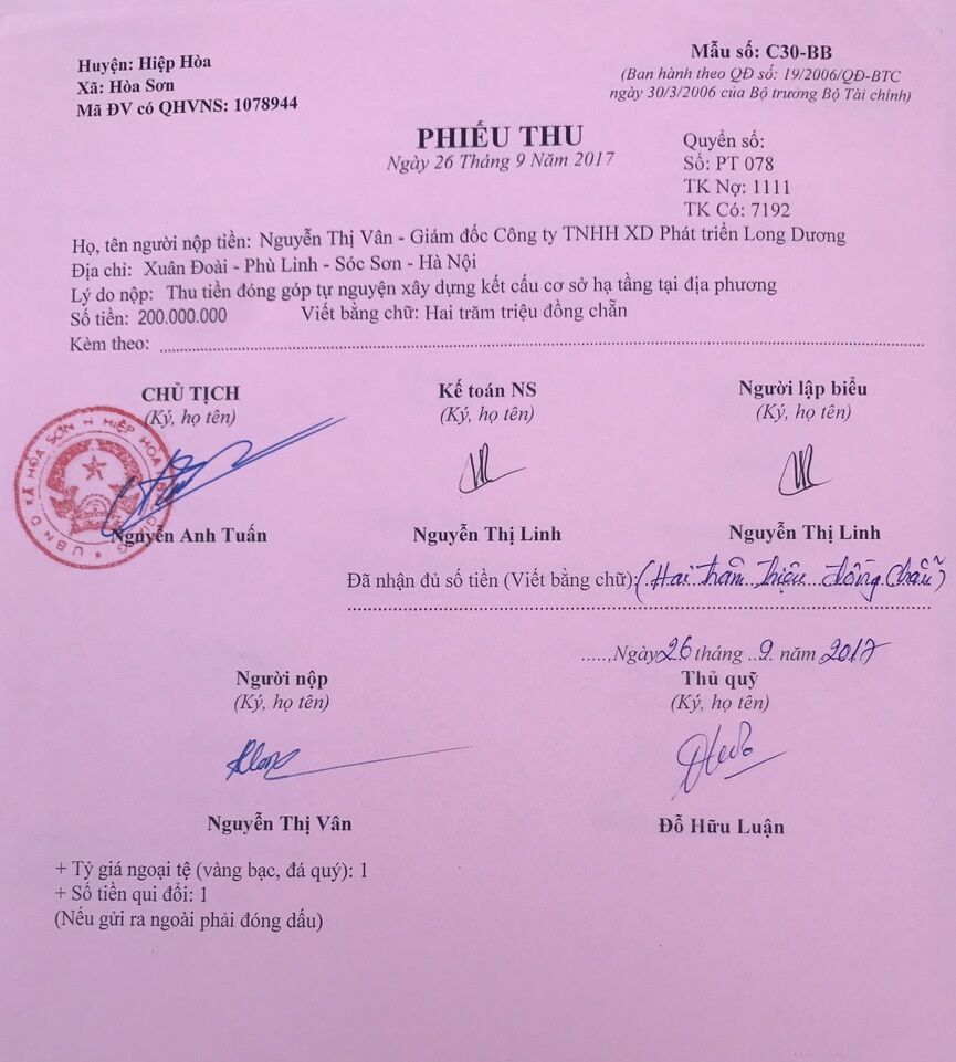 Đáng nói, trong phiếu thu của UBND xã Hòa Sơn lại xuất hiện nhiều bất minh. Trong giao kèo với doanh nghiệp, UBND xã Hòa Sơn nêu vấn đề rất cụ thể là “chuyển nhượng” diện tích 5.520m2 cho doanh nghiệp với giá 400 triệu đồng nhưng tại phiếu thu 2 lần doanh nghiệp nhận được thì lý do thu tiền được đơn vị này đưa ra là: “Thu tiền đóng góp tự nguyện xây dựng kết cấu hạ tầng địa phương”(?). Tại sao lại có sự bất nhất kể trên? Việc đã nhận tiền nhưng không bàn giao đất, ai sẽ là người chịu trách nhiệm? Diện tích đất đó ở đâu, tại sao không được thể hiện ngay từ ban đầu khi quy hoạch?