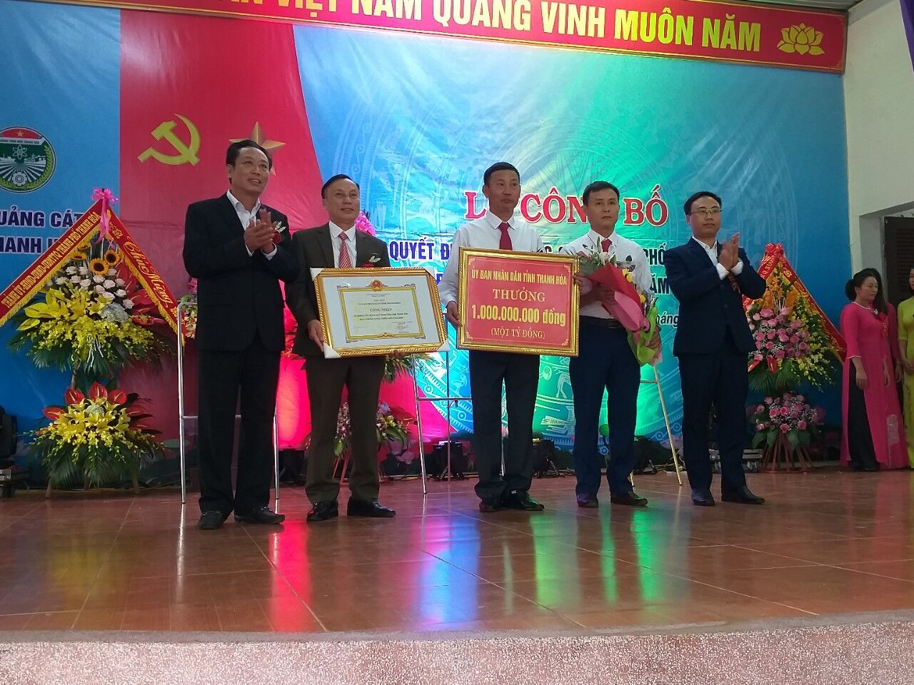 Đại diện lãnh đạo Văn phòng Điều phối xây dựng NTM tỉnh và Tp Thanh Hóa trao quyết định công nhận xã Quảng Cát đạt chuẩn NTM và trao số tiền thưởng cho Chính quyền và nhân dân xã.