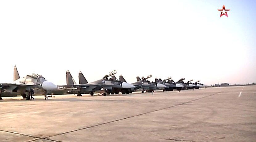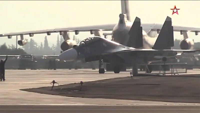 Clip cho thấy một số chiếc Su-30SM của Hải quân Nga cất cánh từ căn cứ không quân Khmeimim cùng với các máy bay Il-78 và Il-20.