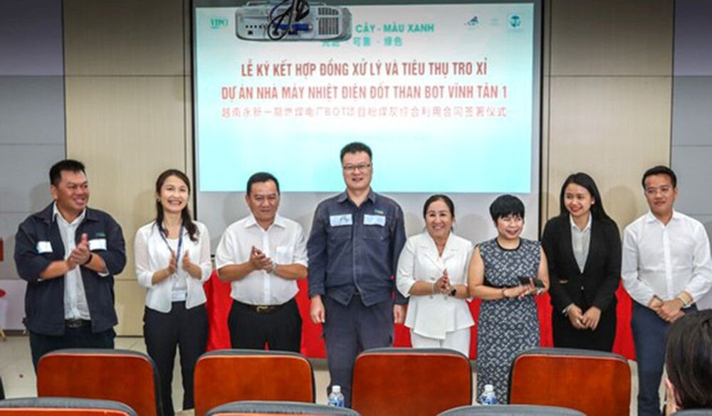 Đại diện Công ty TNHH Orient Wealth cùng các đối tác thương mại ký kết hợp đồng tiêu thụ hơn 770.000 tấn tro, xỉ của Nhà máy Nhiệt điện Vĩnh Tân 1 (3/2021)