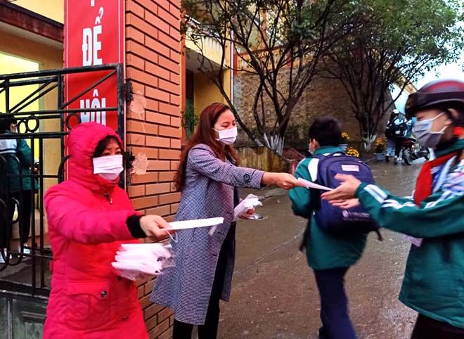 Các cô giáo Trường THCS Quang Trung, thành phố Yên Bái phát khẩu trang miễn phí cho học sinh sáng 3/2