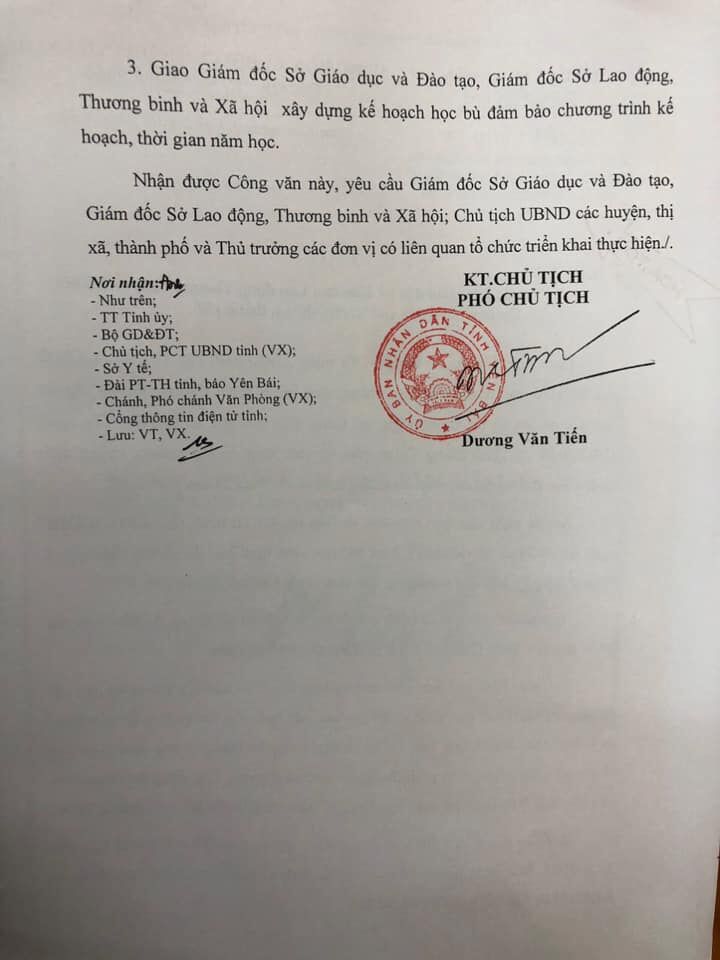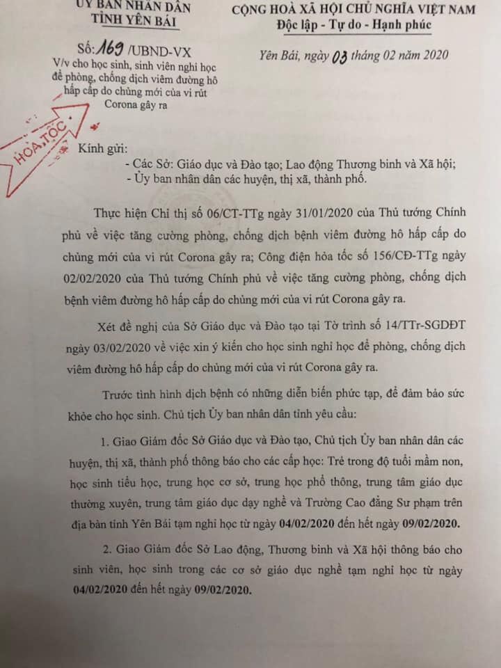Phó Chủ tịch UBND tỉnh Yên Bái Dương Văn Tiến vừa ký Công văn hỏa tốc số 169/UBND - VX gửi Sở Giáo dục và Đào tạo, Sở Lao động - Thương binh & Xã hội; UBND các huyện, thị, thành phố trong tỉnh về việc cho phép học sinh tạm nghỉ học để phòng, chống dịch cúm Corona.